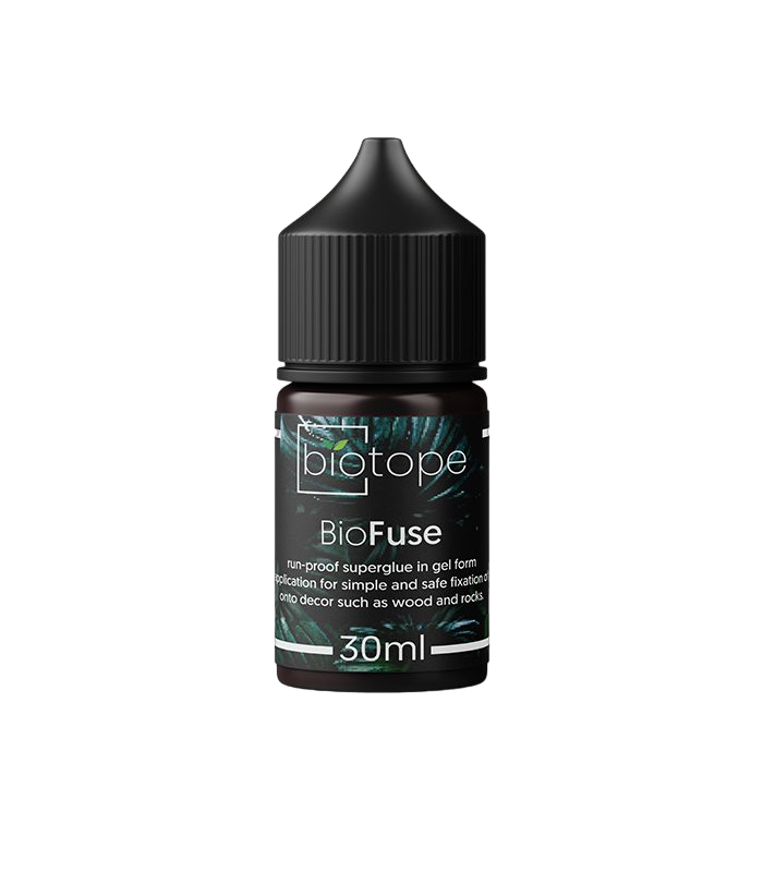 BioFuse run-proof superglue in gel form enables precise application for simple and safe fixation of epiphyte plants and moss onto decor such as wood and rocks.