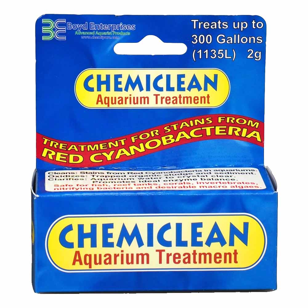 It is completely safe for all fish, corals, invertebrates, and nitrifying bacteria in reef systems. It’s simple, quick and easy to use. Chemiclean works within 48 hours oxidizing trapped organic sludge and promotes an ideal enzyme balance. Chemiclean will clean stains from red cyanobacteria in aquariums.