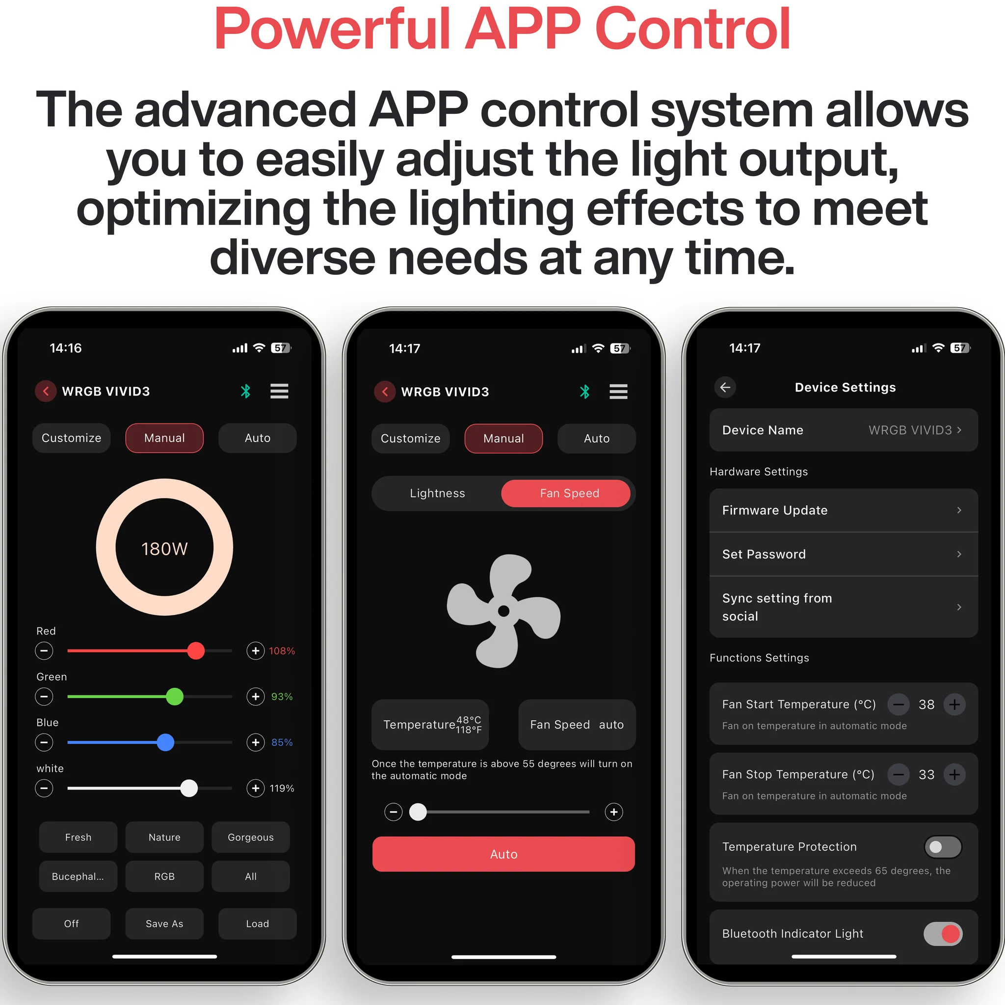 The integrated Smart Cooling Fan technology automatically regulates the temperature. The fan turns on at 38 °C and off again at 33 °C. Without active cooling, the maximum power consumption is 110 W, with fans up to 180 W is possible. This keeps the light intensity constant and increases the lifespan of the LEDs.