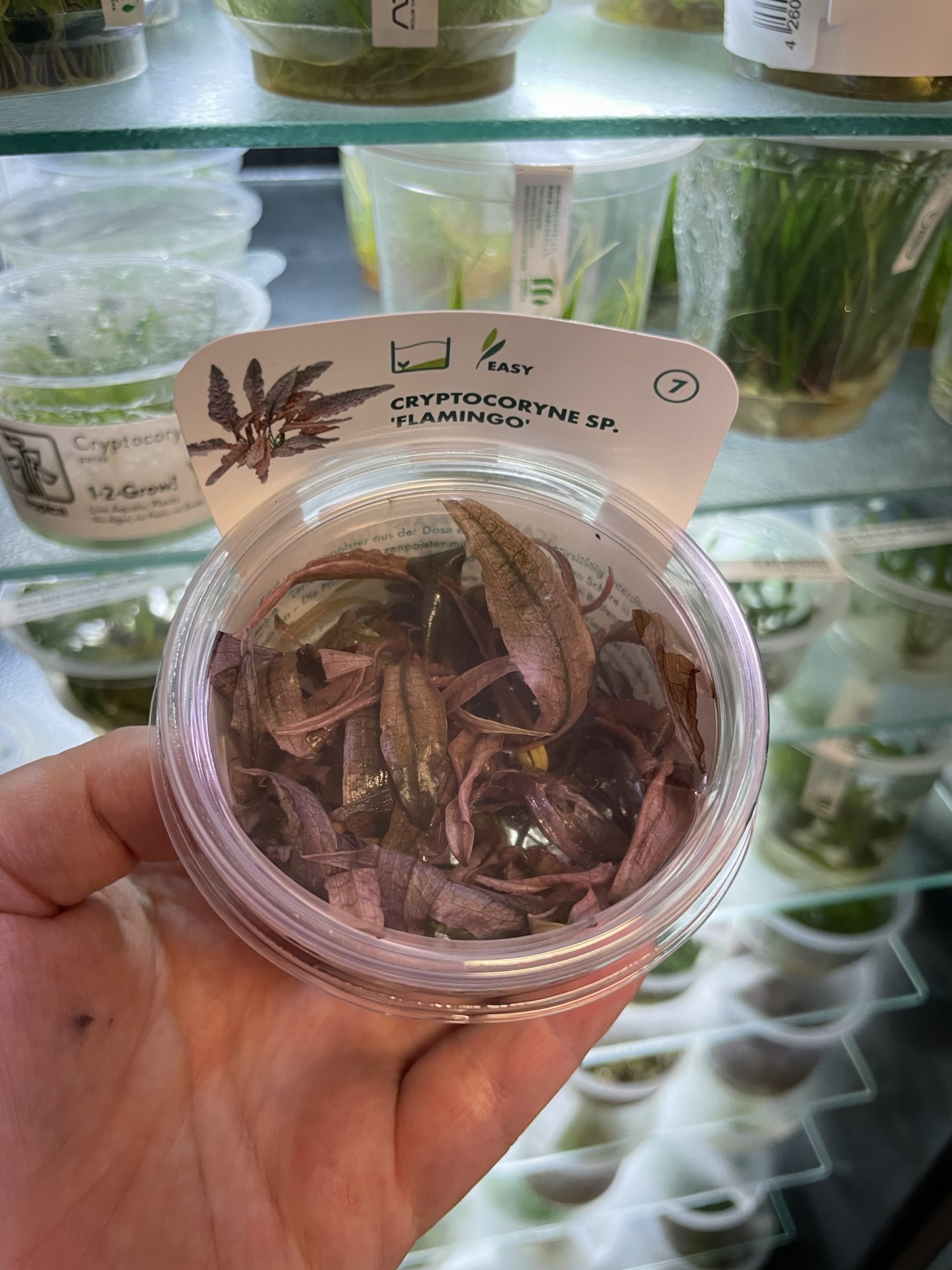 This unusual and attractive cultivar is called ‘Flamingo’. Its most eye-catching feature is the light to dark-pink tones of the leaves. This variety came about by quirk of nature in one of our greenhouses. ‘Flamingo’ is cultivated only through meristem propagation in the lab, and is sold in a plastic culture dish. It grows very slowly in aquariums and must have good lighting to ensure successful rooting and growth. A wonderfully decorative addition combined with mosses or Hemianthus in small aquariums or Nano Cubes.