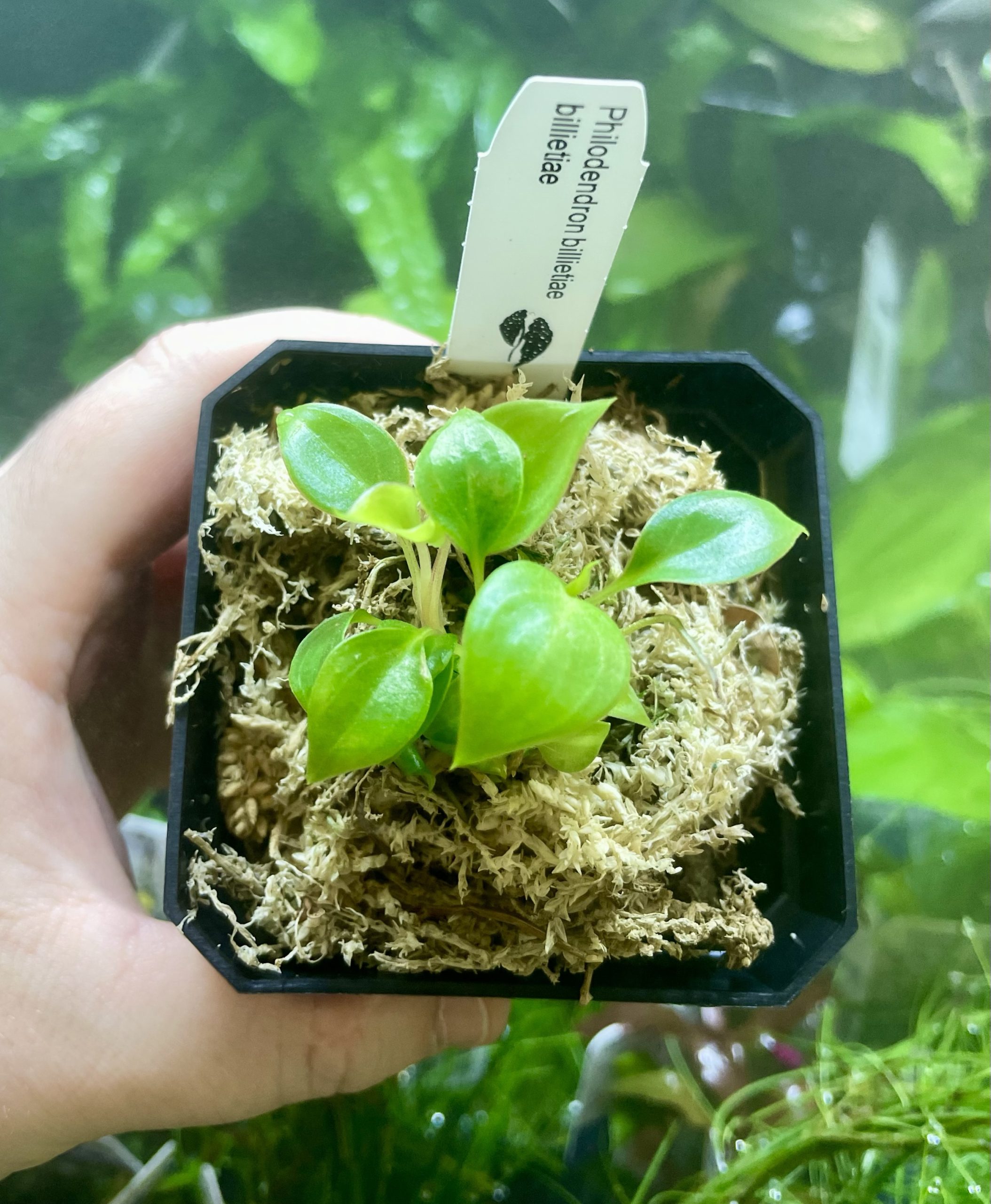 Philodendron billietiae is a striking tropical aroid prized for its elegant growth form and vibrant fresh green foliage. In its juvenile stage it displays compact glossy leaves that make it perfectly suited for terrariums vivariums and high humidity botanical displays.