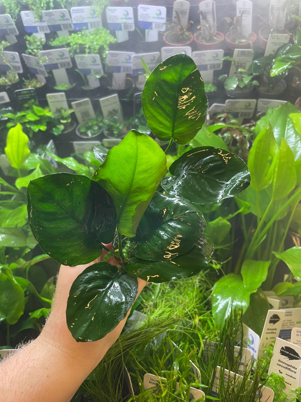 With its dark green, slightly firm leaves it is often used in cichlid aquariums. In the wild, Anubias grow in shaded to semi-shaded locations in fast-flowing rivers and streams; some- times emersed, growing on stones or logs, and sometimes semi-emersed.