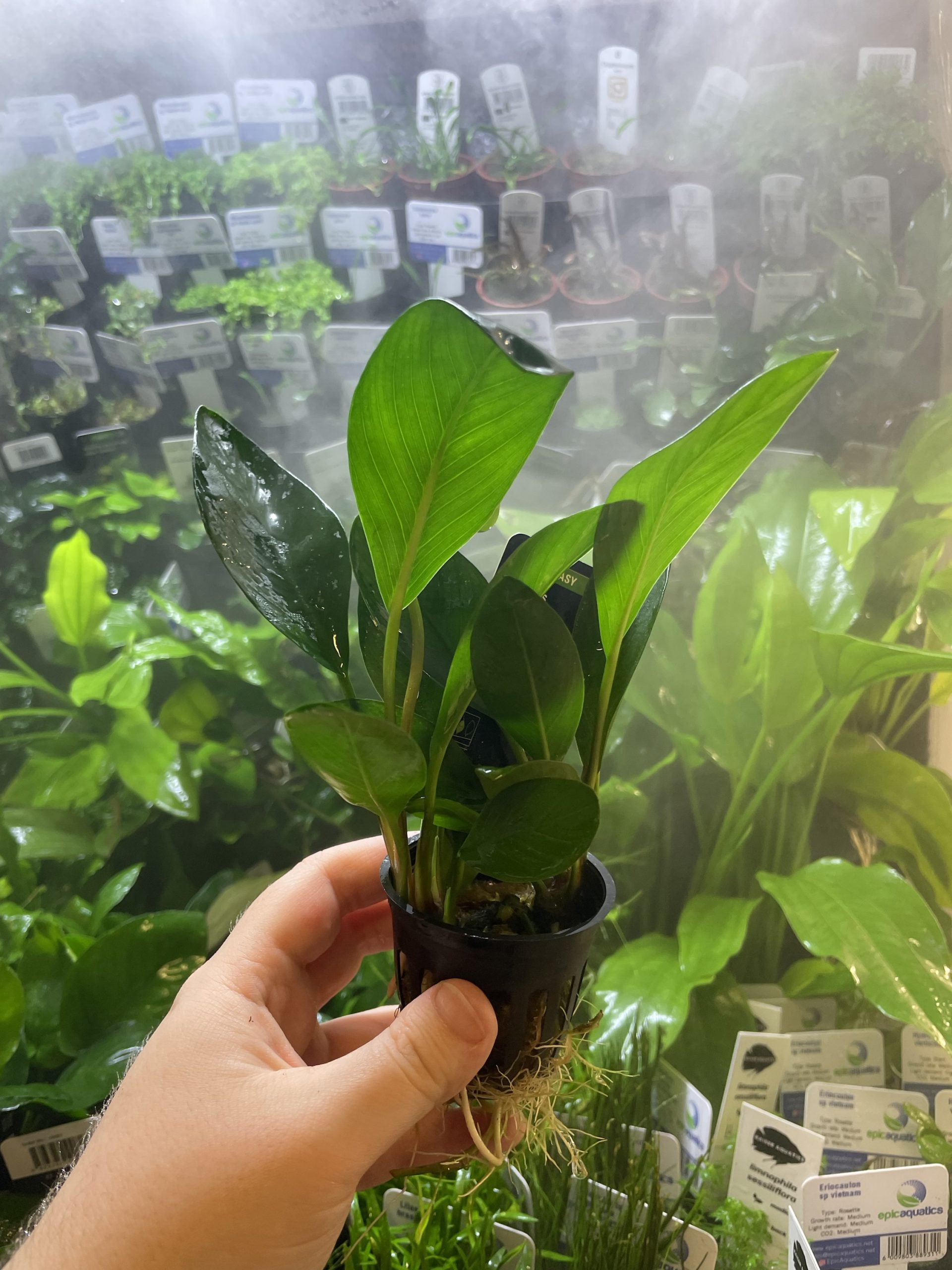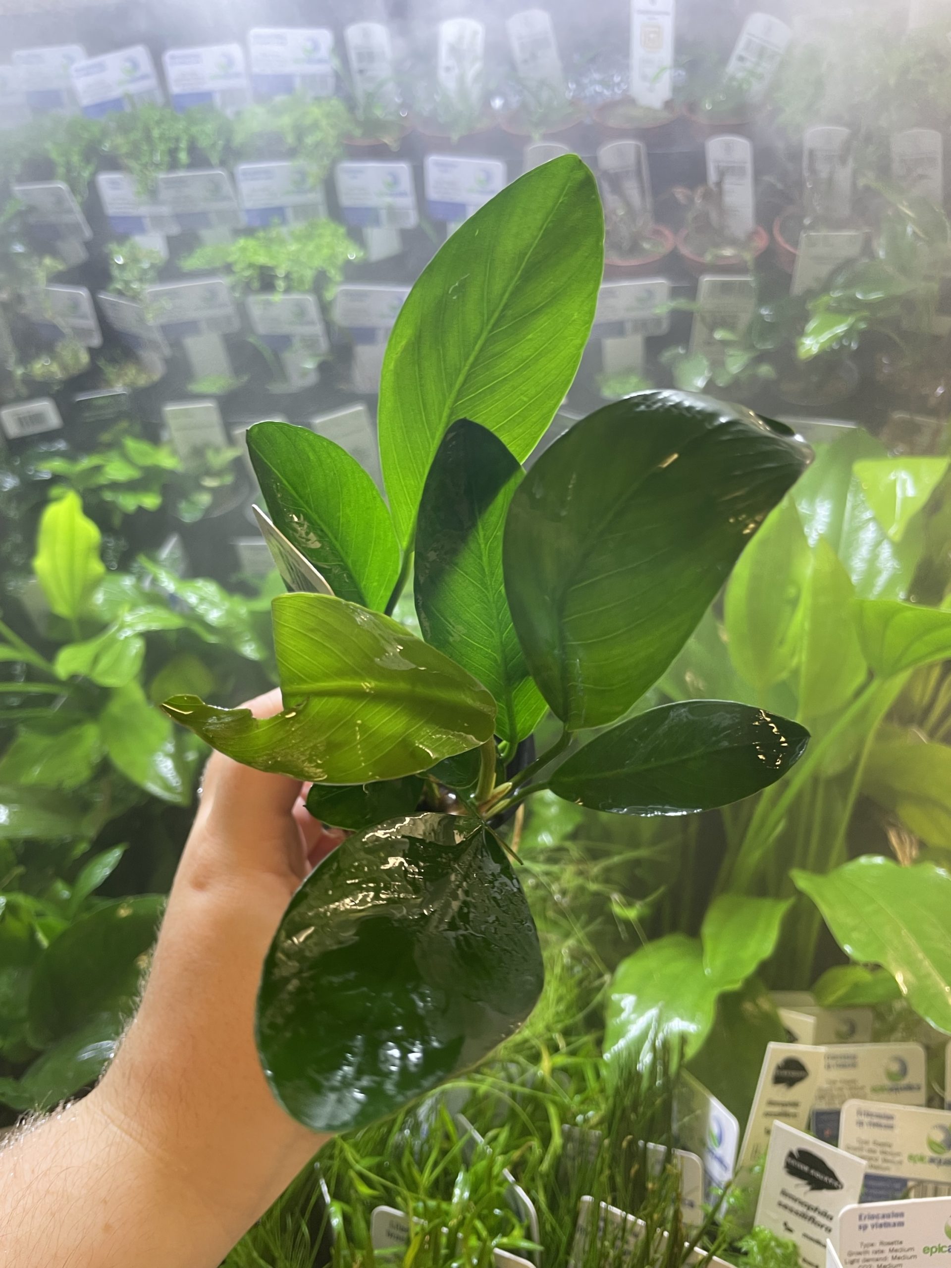 The Anubias heterophylla is a larger Anubias species with long, lance-shaped leaves that make it an impressive addition to midground or background areas of an aquarium. Known for its sturdy, dark green leaves, this plant can thrive in both submerged and emersed conditions, making it highly versatile for a range of aquascapes, including aquariums and paludariums. Like other members of the Anubias family, it is hardy, adaptable, and ideal for aquarists looking for a low-maintenance yet visually impactful plant.